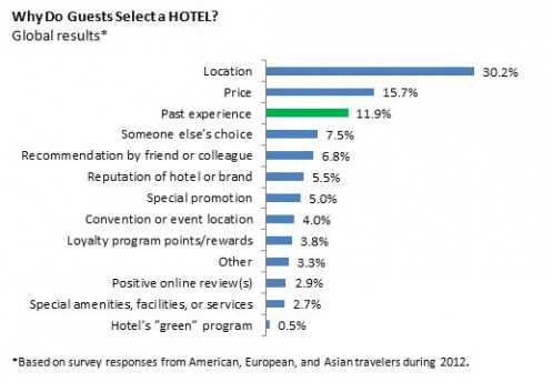 Locatie, prijs en een ervaring in het verleden zijn de belangrijkste redenen om voor een bepaald hotel te kiezen. Dit blijkt uit een studie van de resultaten van de Market Metrix Hospitality Index (MMHI), dat data van 40.000 Amerikaanse, Europese en Aziatische reizigers bevat. Overschatten we de waarde van sociale media en online reviews?