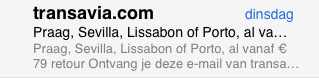 De onderwerpregel is in de inbox van zowel mijn computer als mijn mobiel volledig te lezen. Op de tablet wordt de onderwerpregel afgekapt na “Praag, Sevilla, Lissabon of Porto, al va…”. Of het bewust gedaan is of niet, doordat Transavia.com de onderwerpregel letterlijk herhaald helemaal bovenaan hun nieuwsbrief, is het volledige onderwerp toch leesbaar in de inbox op de tablet.