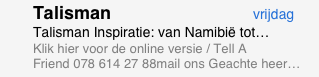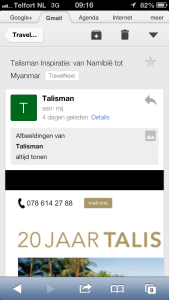 De onderwerpregel van Talisman geeft duidelijk weer wat de insteek van de nieuwsbrief is: “Talisman Inspiratie: van Namibië tot Myanmar. Deze nieuwsbrief staat in het teken van inspiratie. Op de smartphone is de volledige onderwerpregel leesbaar en op de pc uiteraard ook. Op de tablet wordt de onderwerpregel afgekapt en is slechts “Talisman Inspiratie: van Namibië tot…” zichtbaar. Op zich niet heel erg omdat het in dit geval wellicht tot extra openingen leidt omdat mensen willen weten tot waar de inspiratie gaat, maar dat zal vermoedelijk niet de opzet geweest zijn.