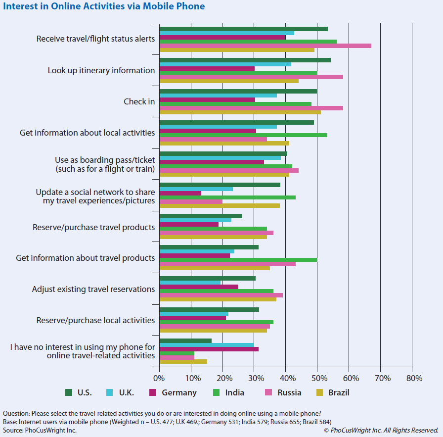 Tot slot, ook al is het al vaak gezegd: “Mobiel, mobiel en nog eens mobiel.” Interessant om te zien is echter waar de precieze behoeftes liggen (zie grafiek). Naast de praktische sturing op het gebied van inchecken en digitale updates van de reisbescheiden, geeft bijna 50% van de Amerikaanse respondenten aan graag informatie te ontvangen over actuele activiteiten op de plaats van bestemming. Opvallend is dat Europa hierin achterloopt, terwijl de respondenten uit de BRIC-landen juist relatief hoog scoren. Niet alleen op deze vraag scoren zij hoog, maar ook op vele andere vragen scoren zij hoger dan wij ‘Westerlingen’ als het gaat om de behoefte aan mobiele ondersteuning tijdens de vakantie. Het lijkt alsof veel moderne reizigers uit deze snel opkomende economieën onze ‘desktop-decade’ hebben overgeslagen, en direct mobiel zijn gegaan en daarmee wellicht voorlopen op Europa. Door de huidige wereldwijde behoefte om mobiele aankopen te doen op de plaats van bestemming, wordt aangetoond dat het eerder besproken ‘stretchen’ van het vakantieproduct financieel aantrekkelijk is. Want als het onderzoek onder de ‘early-adaptors’ een representatief beeld schetst van de toekomstige vakantieganger, dan zal de wereldwijde vraag naar mobiele sturing tijdens de vakantie de komende jaren fors toenemen. Ik blijf dan ook van mening dat dit grote kansen biedt voor zowel het inkomend als uitgaand toerisme wereldwijd.