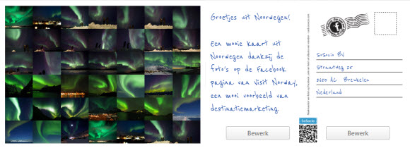 Ik kan er ook voor kiezen de kaart helemaal niet te versturen, maar gewoon gratis via Facebook te delen. Wat me vooral erg aanspreekt is de mogelijkheid om naast mijn eigen Facebook foto’s, ook de Facebook foto’s van mijn reispartner of bijvoorbeeld van de Facebook-pagina van de reisorganisatie of bestemming te gebruiken.