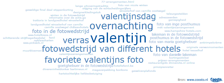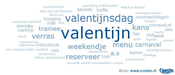 Allereerst heb ik in Coosto gekeken hoeveel mensen op social media praten over Valentijnsdag in combinatie met woorden zoals ‘hotel’, ‘nachtje weg’, ‘overnachting’ en ‘ertussenuit’. Ik vind zo’n 3.000 berichten: